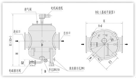型號 管徑 mm 過濾 流量 m3/h 過濾面積 cm2 電磁排污閥DN1 mm 一次清洗水量L 清洗排污閥DN1 mm 電機(jī)功率 KW 重量 Kg D mm H mm H1 mm H1 mm H2 mm E mm D1 mm B mm C mm C1 mm D mm