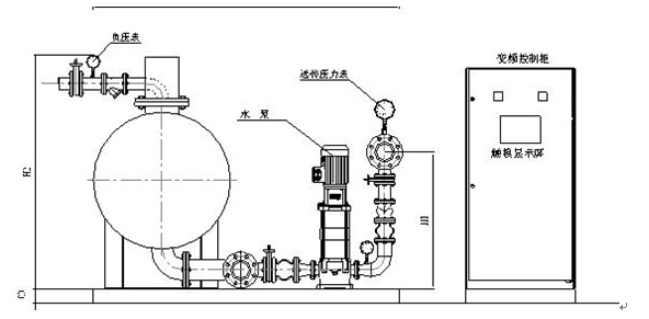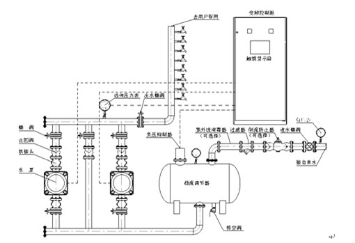 RWG系統(tǒng)智能型無負(fù)壓變頻供水設(shè)備是由穩(wěn)流調(diào)節(jié)器、負(fù)壓抑制器、水泵機組、智能變頻控制柜、遠(yuǎn)傳壓力表、各種閥門管件等組成。其原理圖如下所示。